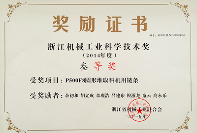 4月23日,浙江省機(jī)械工業(yè)聯(lián)合會(huì)四屆二次理事(擴(kuò)大)會(huì)議暨2014年度科學(xué)技術(shù)獎(jiǎng)?lì)C獎(jiǎng)大會(huì)在杭州召開。會(huì)上,浙江機(jī)械工業(yè)聯(lián)合會(huì)表彰了52項(xiàng)“2014年度浙江機(jī)械工業(yè)科學(xué)技術(shù)獎(jiǎng)”獎(jiǎng)勵(lì)項(xiàng)目。由東華集團(tuán)技術(shù)中心組織申報(bào)、集團(tuán)所屬杭州自強(qiáng)鏈傳動(dòng)有限公司工程鏈?zhǔn)聵I(yè)部為主研發(fā)的“P500F8圓形堆取料機(jī)用鏈條”高端產(chǎn)品項(xiàng)目榮獲三等獎(jiǎng),這是東華集團(tuán)的產(chǎn)品創(chuàng)新項(xiàng)目連續(xù)三年榮獲浙江省機(jī)械工業(yè)科學(xué)技術(shù)獎(jiǎng),也是2014年度全省諸多機(jī)械產(chǎn)品中唯一一項(xiàng)鏈傳動(dòng)產(chǎn)品開發(fā)項(xiàng)目獲獎(jiǎng)。