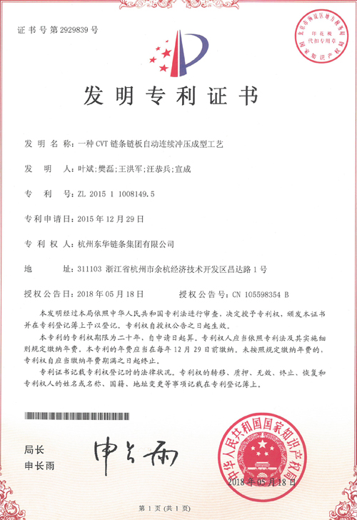 另,2019年12月,集團(tuán)知識(shí)產(chǎn)權(quán)管理體系順利通過中知(北京)認(rèn)證有限公司的年度監(jiān)督審核,進(jìn)一步證實(shí)了集團(tuán)公司知識(shí)產(chǎn)權(quán)管理體系運(yùn)行有效性。同時(shí),《2019年度浙江省專利項(xiàng)目績(jī)效評(píng)價(jià)(專利獎(jiǎng))結(jié)果公示》,集團(tuán)公司“一種CVT鏈條鏈板自動(dòng)連續(xù)沖壓成型工藝”發(fā)明專利榮獲浙江省專利優(yōu)秀獎(jiǎng)。