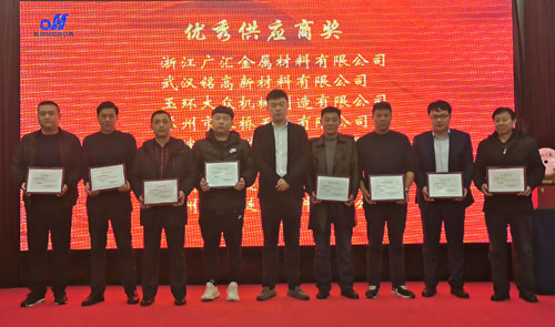 會上,副董事長宣成向2019年度優秀供應商和獲得優秀配套服務獎的企業代表頒獎,并合影留念。優秀供應商代表,浙江廣匯金屬材料有限公司總經理沈永躍上臺作了熱情洋溢的發言。優秀配套服務獎代表德清麗順汽車配件有限公司總經理趙國民上臺作了熱情洋溢的發言。
