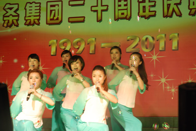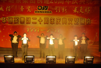 整場慶典晚會(huì)由18個(gè)文藝節(jié)目組成,其中16個(gè)節(jié)目由東華員工自編、自演,這些節(jié)目包括歌舞、小品、雜技、啞劇等等,節(jié)目集思想性、藝術(shù)性和觀賞性為一體。員工們以優(yōu)美的歌聲、輕盈的舞姿、蓬勃的激情,充分展示了東華創(chuàng)建20年來所發(fā)生的巨大變化和取得的輝煌業(yè)績,栩栩如生地體現(xiàn)了東華兒女團(tuán)結(jié)奮進(jìn)、求真務(wù)實(shí)、開拓創(chuàng)新的良好形象和精神風(fēng)貌。宣碧華董事長的一首清唱《讀毛主席的書》,把整臺(tái)晚會(huì)推向了高潮,員工們掌聲不斷。