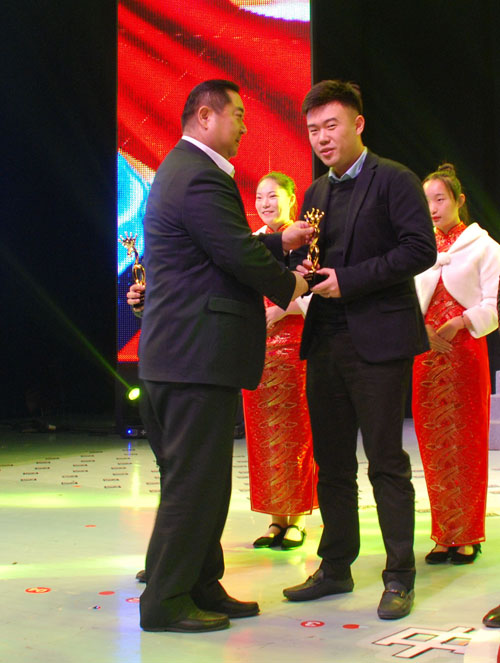副董事長宣成(中)與其他十佳創(chuàng)業(yè)明星高興獎杯