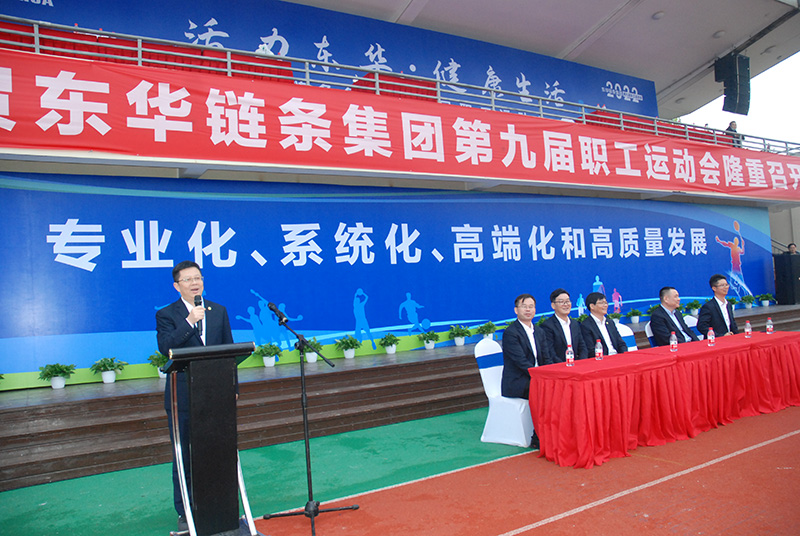 這些年來,東華鏈條集團在各級政府、客戶、合作伙伴的關心和支持下,全體東華人不斷努力,攻堅克難,取得了良好的成績,同時,我們也在關注職工身心健康和全面發展。近年成立了10個運動俱樂部,吸引不同興趣愛好的職工投入到運動中。今天下起小雨,這為運動會增添了一層含義,就是企業在發展中,講天時、地利、人和,但其中天時是我們無法控制的,就像這個市場環境是我們沒有辦法決定的,但是我們今天仍然克服了各種困難,讓運動會按時舉辦,這是通過這屆運動會向我們全體東華人傳遞一個信心,即無論我們的市場環境如何變化,我們都要奮發圖強,勇往直前。希望大家在運動會上秉持更快、更高、更強、更團結的奧林匹克精神,讓東華在這樣一種運動精神的指引下,讓我們把運動精神帶到以后的工作當中,讓我們一起為東華成為世界領先的鏈傳動企業而奮斗。