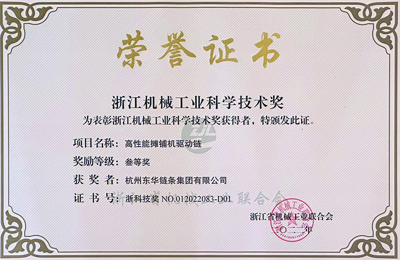 4月27日,浙江省機械工業(yè)聯(lián)合會召開會員大會,會上隆重表彰了2022年度浙江機械工業(yè)科學(xué)技術(shù)獎。東華鏈條集團自主研發(fā)的“高性能攤鋪機驅(qū)動鏈”產(chǎn)品獲評三等獎,這是2022年全省機械行業(yè)科技創(chuàng)新成果中僅有的兩項高端鏈傳動產(chǎn)品及制造裝備獲獎項目之一,也是東華產(chǎn)品創(chuàng)新項目連續(xù)十一年獲評浙江機械科技獎。