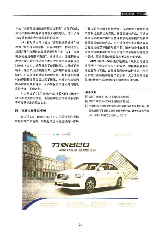 由杭州東華鏈條集團(tuán)有限公司主持修訂的GB/T 10855—2016《齒形鏈和鏈輪》新版國(guó)家標(biāo)準(zhǔn),自2016年9月1日起實(shí)施;這是中國(guó)鏈傳動(dòng)領(lǐng)域近期新發(fā)布的一項(xiàng)重要標(biāo)準(zhǔn)。為更好地宣貫好這項(xiàng)新標(biāo)準(zhǔn),應(yīng)《中國(guó)標(biāo)準(zhǔn)導(dǎo)報(bào)》雜志社的約稿要求,東華集團(tuán)技術(shù)中心技術(shù)標(biāo)準(zhǔn)化人員撰寫了《新版鏈傳動(dòng)領(lǐng)域重要產(chǎn)品標(biāo)準(zhǔn)GB/T 10855—2016〈齒形鏈和鏈輪〉主要技術(shù)變化解讀》這篇標(biāo)準(zhǔn)解讀論文,已刊登在《中國(guó)標(biāo)準(zhǔn)導(dǎo)報(bào)》2016年第4期上。下面將這篇論文轉(zhuǎn)載如下: